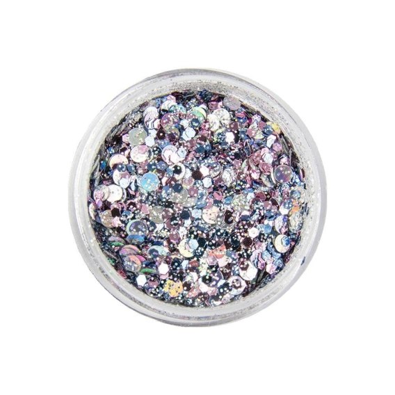 Pokaż siebie w nowej odsłonie. Idealna proporcja drobnego pyłku z dużymi widocznymi drobinami przypominającymi odbijające światło lusterka. Zachwycaj blaskiem w kolorze metalicznego aluminium z pobłyskiem różu i niebieską poświatą.
